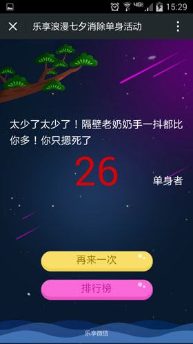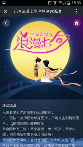 功能亮点:七夕专属活动,为商家七夕活动带来专属的活力,简单轻松的玩法,美轮美奂的界面又不失传统,让你的每个用户都浪漫起来吧!