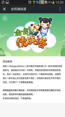 成语(chengyu,idioms)是中国汉字语言词汇中一部分定型的词组或短句。成语是汉文化的一大特色,有固定的结构形式和固定的说法,表示一定的意义,在语句中是作为一个整体来应用的。成语有很大一部分是从古代相承沿用下来的,在用词方面往往不同于现代汉语,它代表了一个故事或者典故。