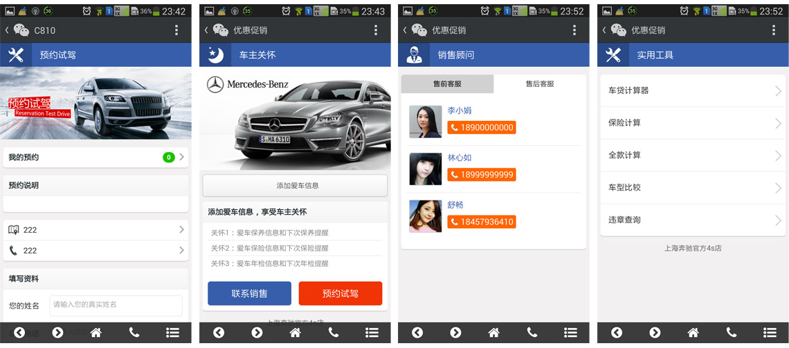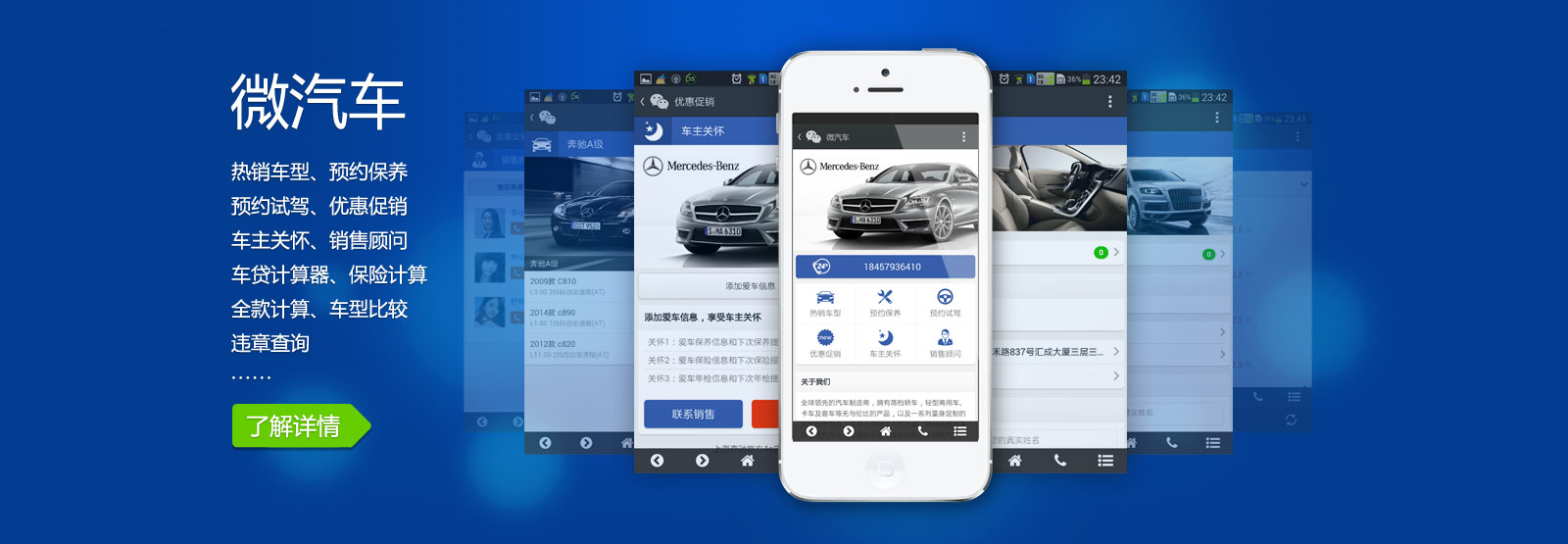 功能亮点:有汽车销售管理、预约保养、预约试驾、保险计算、车贷计算、车型比较、违章查询、360度全景看车、车主关怀等功能,整个过程非常便捷,省时省力,快速便捷的实现了商家的销售管理与预约过程,同时也实现了客户无需进入4s店就能进行预约保养和试驾的功能。