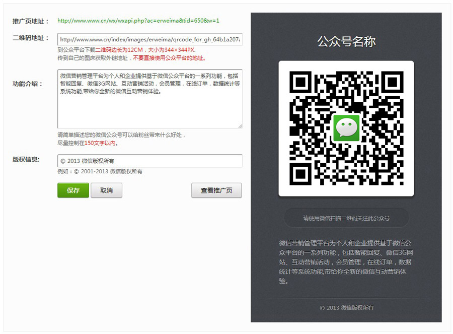 只需要填写二维码地址,简单介绍你公众号的特点,就可以自动生成一个漂亮的PC推广页面,方便你分享给好友,分享到微博,论坛,博客等等,起到好的推广的作用。