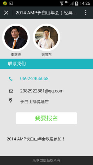 功能用途:用于大型活动、会议等,邀请人员参加的微信邀请函。可以实现微信报名,通知参与者日程安排等。