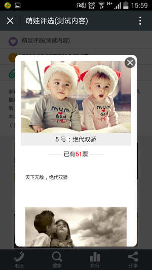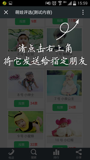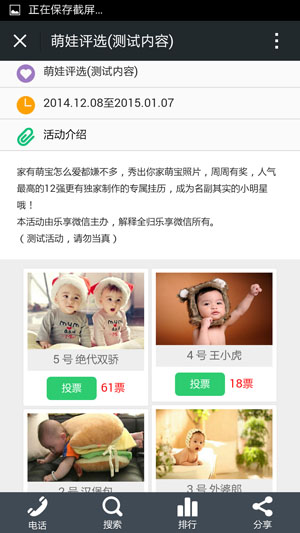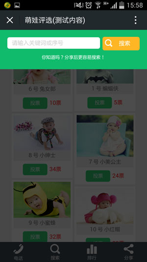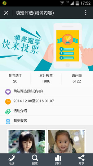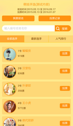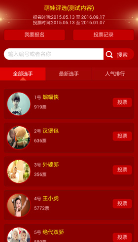 使用技巧:实时数据显示(参与选手,累计投票,访问量等),电话可直接跳转到拨号界面,选手报名参赛后后台可审核,搜索可以直接输入关键词搜索,排行版也是实时按投票数显示!