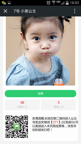 底部有投票按钮,并且有公众账号二维码,提示用户长按关注,可用来拉粉丝