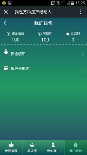 4.我的钱包显示资金明细,并且支持绑定银行卡。