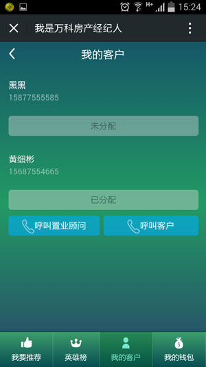 3.我的客户,经纪人推荐的客户显示在此,支持一键呼叫置业顾问或者客户。